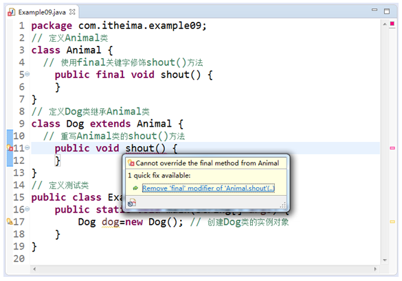 当一个类的方法被final关键字修饰后,这个类的子类将不能重写该方法。接下来通过一个案例来进行修饰演示和验证,过程如下:查看全文>>